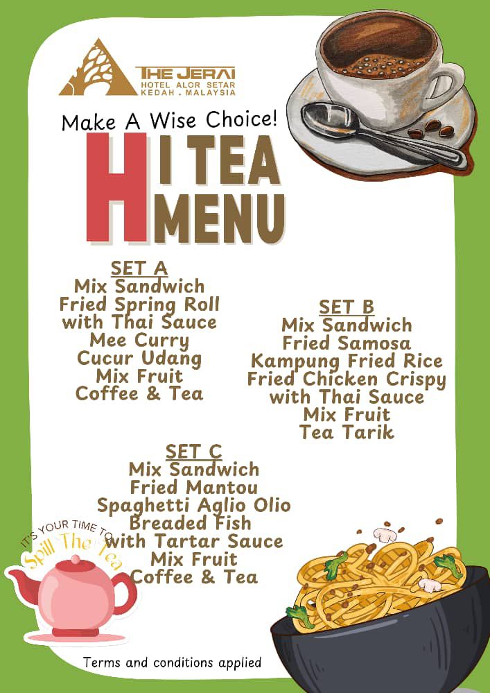 Spend a relaxing afternoon with our Hi-Tea Package in at our restaurant. Enjoy a selection of meals, savory bites, and local delights — perfect for gatherings, small celebrations, or casual meet-ups.
